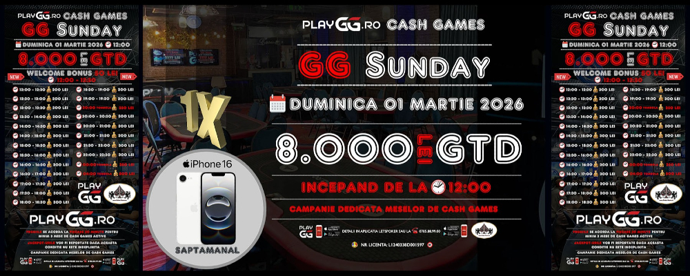 ♣️ Campania NEW GG Sunday la Cash 🥂 📆 Dum 01 Mar 2026 de la ⏰ 12:00 🔥 💰 8.000 Lei GTD + 1 x IPhone 16 🔥 ⏰ Welcome Bonus 50 Lei ⏰ 12:00 - 12:30 🔥