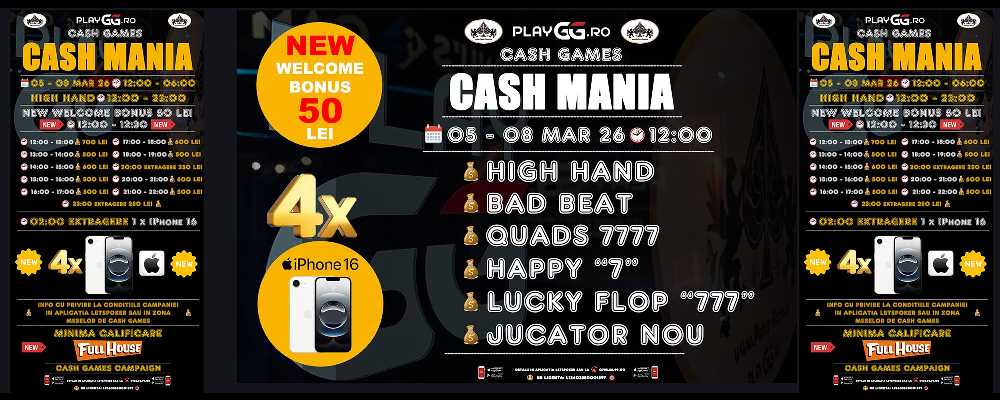 ♠️ Campania NEW Cash Mania Incepe JOI 🔥 📆 Perioada 05 - 08 Mar 26 🔥 💰 4 x IPhone 16 BONUS 🔥 💰 NEW Welcome Bonus 50 LEI 🔥