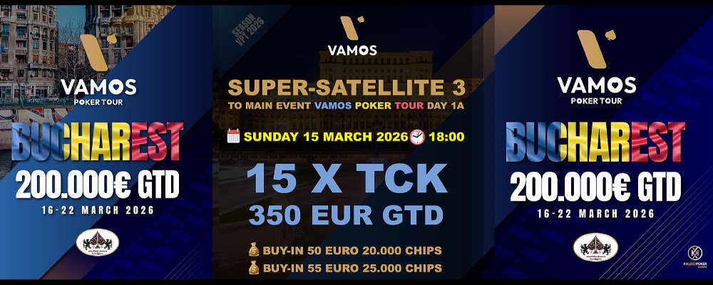 ♠️ SuperSatelit 3 to Main Event Vamos Day 1A de la 18:00 la Play GG Poker Room Bucuresti 🔥 15 Tichete x 350 Euro GTD 🔥