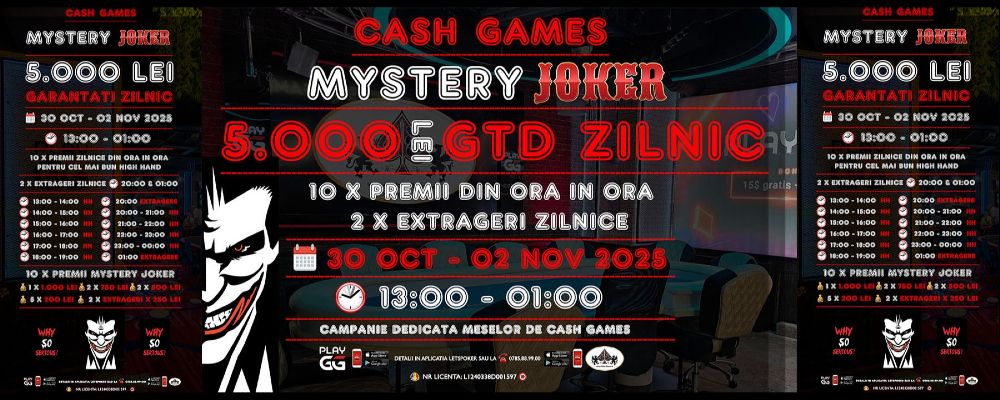 ♠ Campania Mystery Joker la Mesele de Cash Games 🔥 📆 Joi 30 Oct - Dum 02 Nov 2025 🔥 ⏰ 13:00 - 01:00 🔥 💰 5.000 Lei GARANTATI x 4 ZILE 🔥